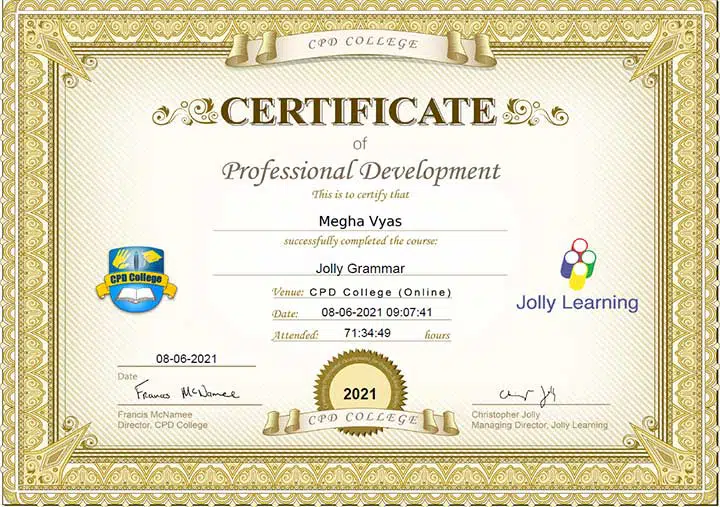 Megha Vyas in Jolly Reading is an Education Consultant who has Certification for Jolly Phonics & Jolly Grammar from JOLLY PHONICS CPD College UK.